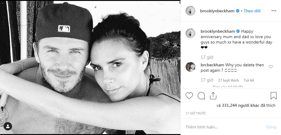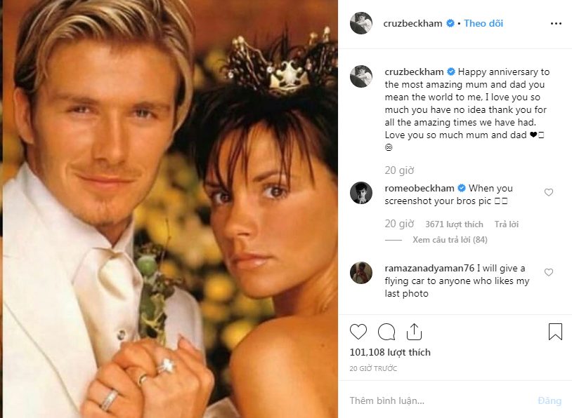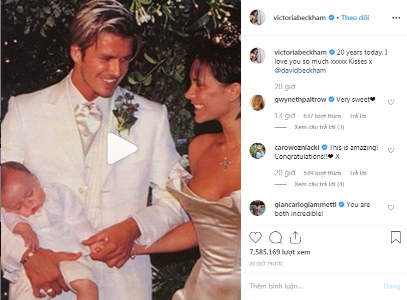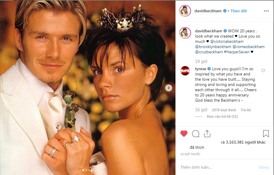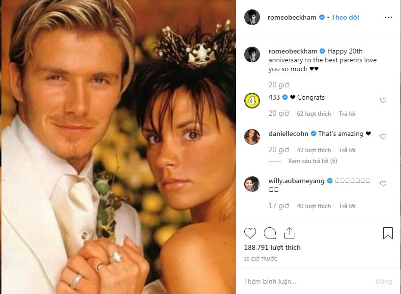 Để chúc mừng cho 20 năm ngày cưới của mình, David Beckham đã đăng một số tấm hình của anh và Victoria trong ngày cưới 20 năm trước đồng thời con tag những người con và vợ của mình với caption: