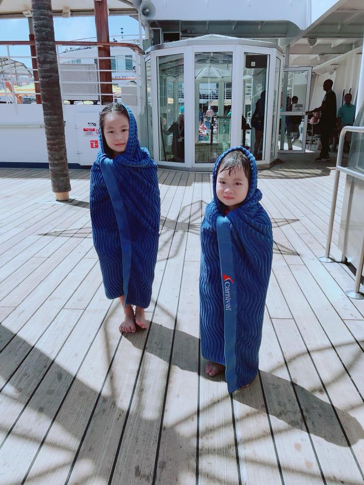 Cherry và Sunny sau khi tắm hồ bơi trên du thuyền được mẹ quấn khăn lại yêu chưa này?