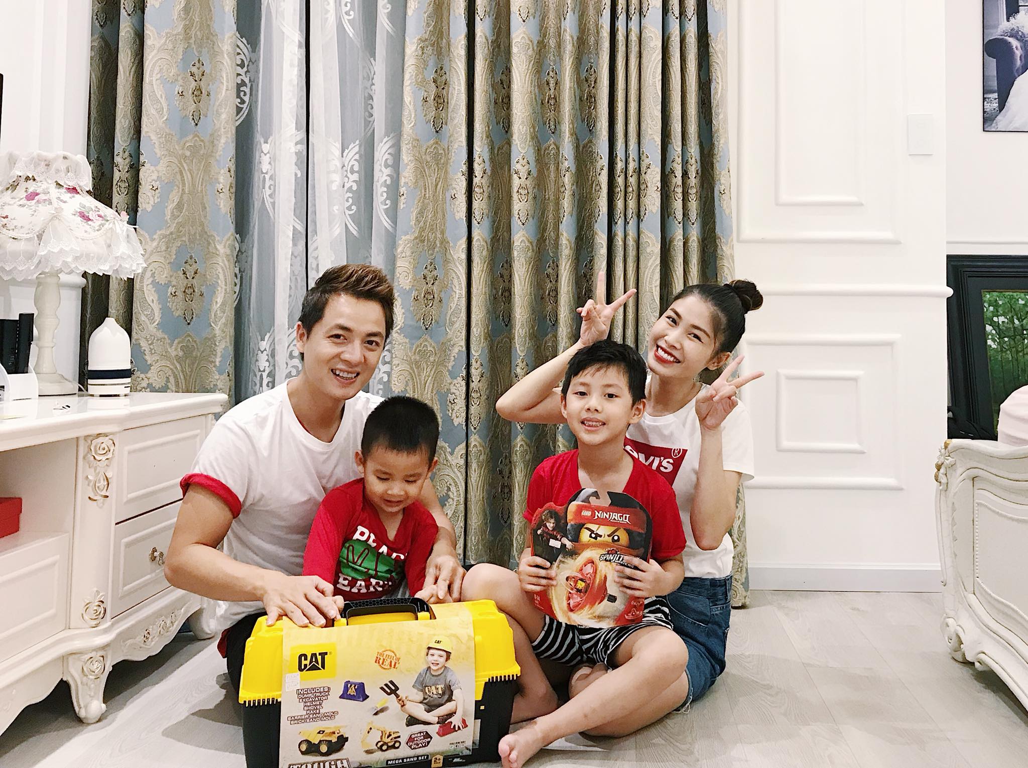 Hai con trai của Đăng Khôi vui vẻ bên quà tặng 1/6 của mình. Được biết Ken mê lắp ráp và Đăng Anh thì ước mơ trở thành chú công nhân lái xe cẩu nên bố mẹ đã cố ý mua những món quà đúng ý cho hai bé.