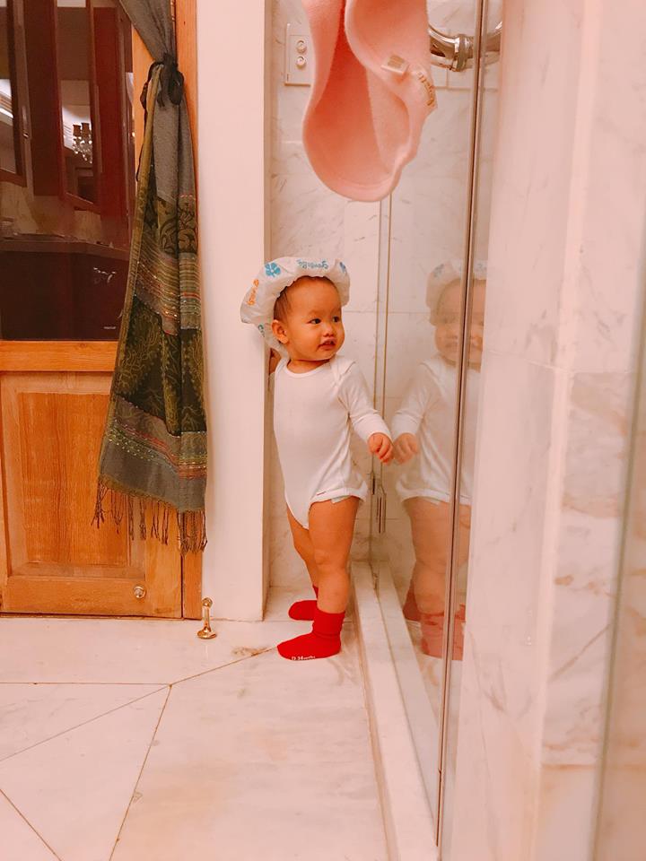 Bé Bồ Câu - con gái của đại gia Đức An và người đẹp Phan Như Thảo được mẹ diện cho bộ jumsuit trắng đáng yêu.