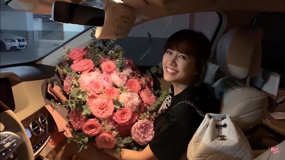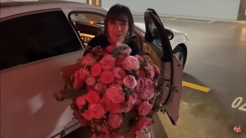 Bó hoa 'siêu to khổng lồ' này khiến Hari không thể di chuyển và phải nhờ đến sự trợ giúp của ông xã để mở cửa xe cho cô bước xuống