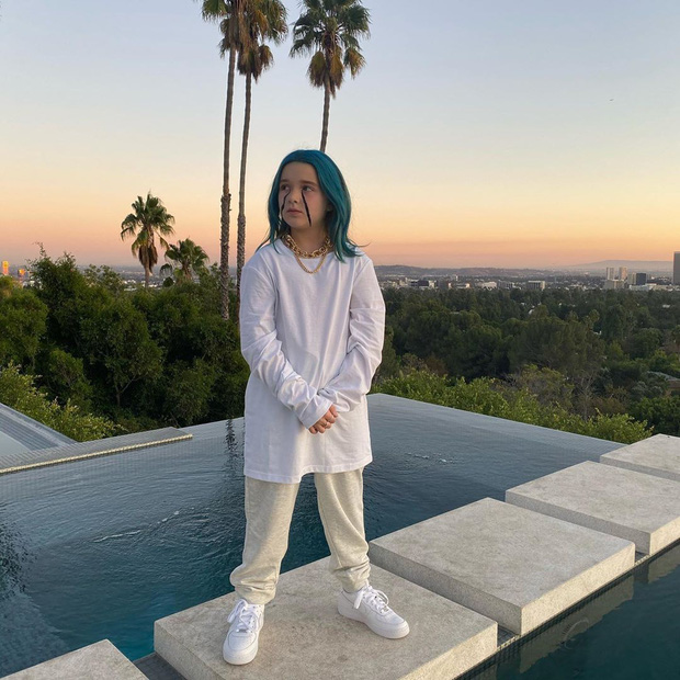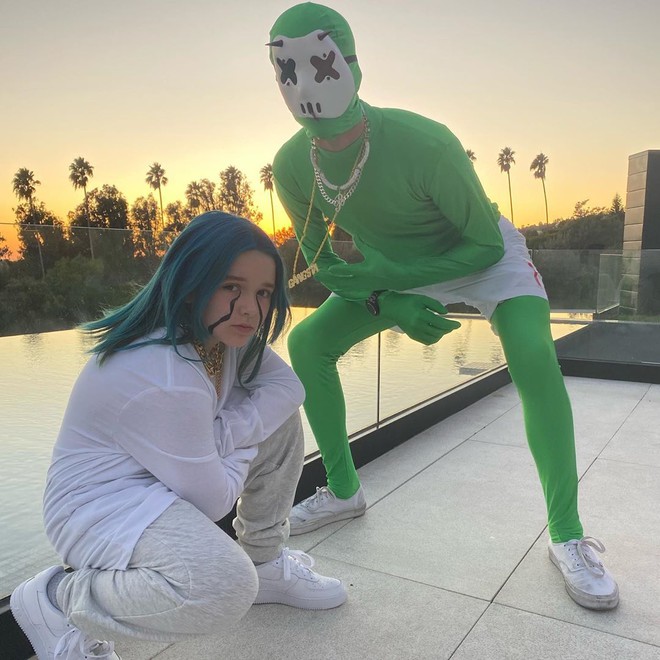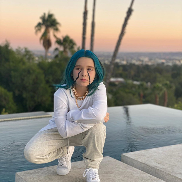 Gây chú ý nhất chính là màn hóa thân thành nữ ca sĩ Billie Eilish của cô bé út Harper Beckham. Không còn hình ảnh dịu dàng nữ tính như ngày trước, Harper khiến nhiều người phải trầm trồ khi xuất hiện cực ngầu với mái tóc được nhuộm xanh và cách trang điểm cùng phong cách ăn mặc giống với Billie Eilish, nữ ca sĩ mà cô bé yêu thích.