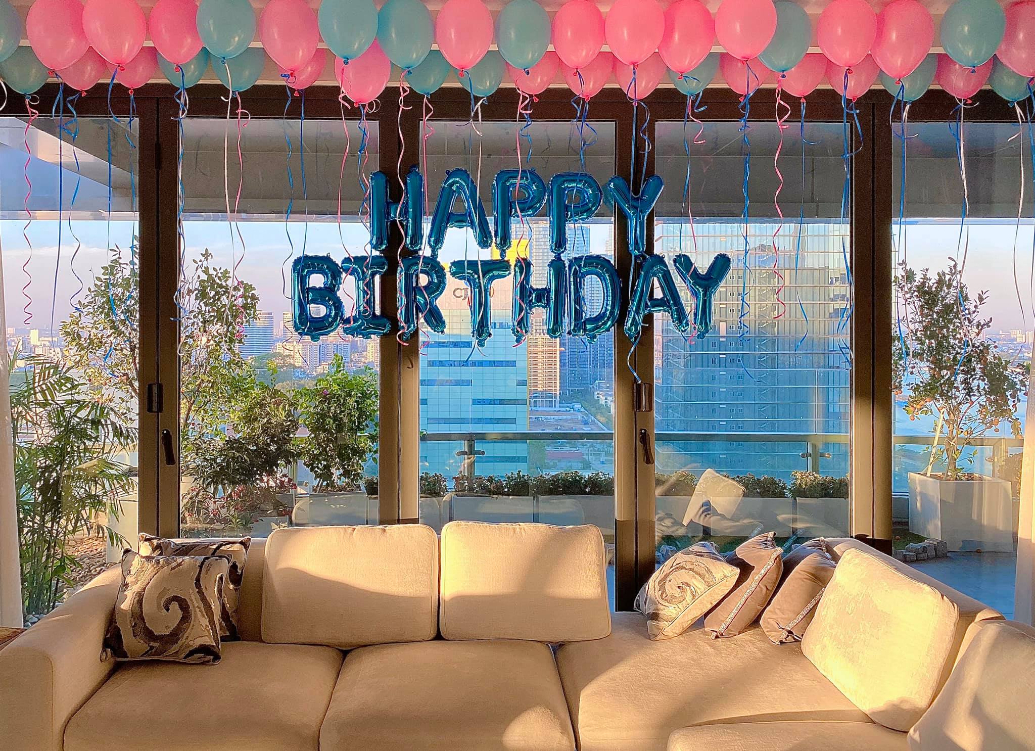Vì dịch bệnh nên thay vì tiệc tùng hoành tráng, vợ chồng cô đã bày trí không gian trong nhà đầy ấm cúng với bong bóng và bánh kem