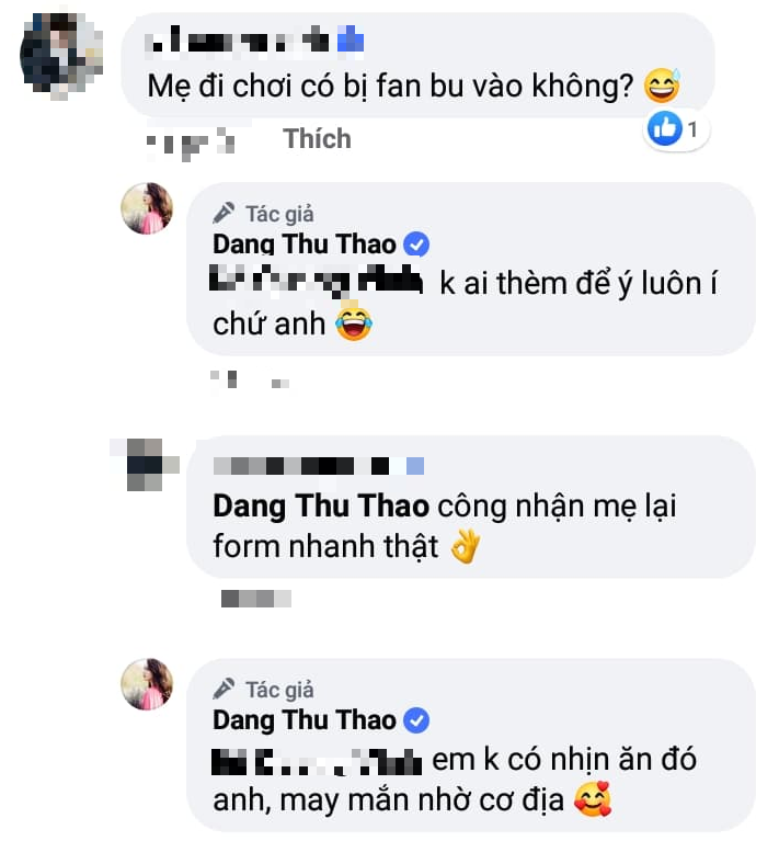 Đặc biệt, bên dưới bài đăng, khi một người bạn để lại bình luận nhận xét Đặng Thu Thảo “công nhận mẹ lại form nhanh thật”, thì cô đã trả lời “em không có nhịn ăn đó anh, may mắn nhờ cơ địa” như ngầm thừa nhận việc đã lấy lại vóc dáng sau gần 2 tuần sinh quý tử thứ hai.