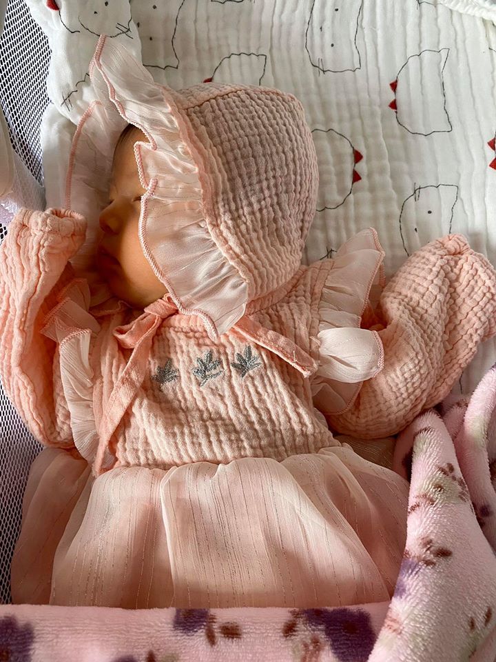 Bé Nấm (tên con gái Jennifer Phạm) như nàng công chúa đang ngủ say trong chiếc váy màu cam nhạt