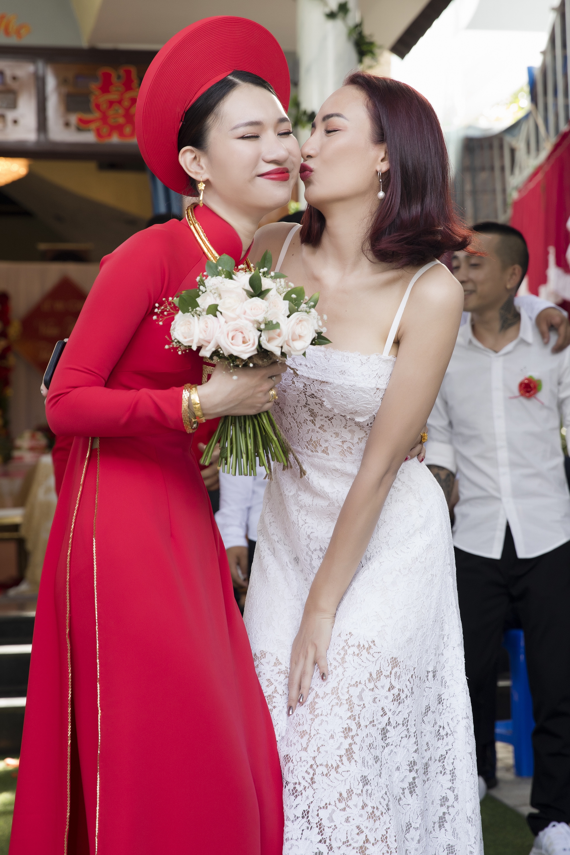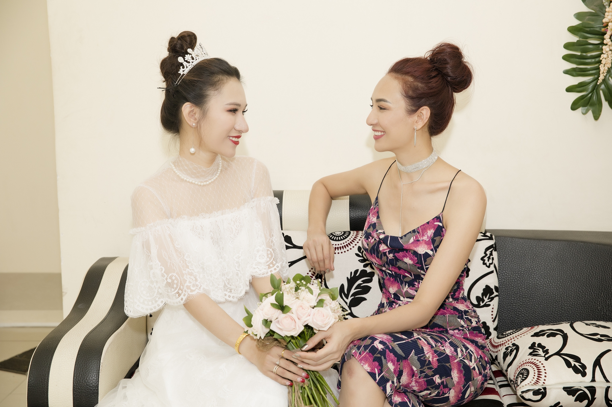Nàng hậu Ngọc Diễm luôn ở bên tỉ mỉ hỗ trợ em gái về trang phục, chỉnh trang tóc tai trước giờ làm lễ cưới