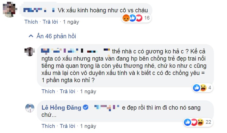 Tuy nhiên lại có một cư dân mạng đã buông lời chê bai thậm tệ tới nhan sắc của bà xã nam diễn viên khiến cho không ít bạn bè và người hâm mộ của Hồng Đăng bày tỏ sự phẫn nộ. Cụ thể người này đã viết: “Vợ xấu kinh hoàng như cô với cháu“. Trước bình luận chê vợ xấu Hồng Đăng sau đó cũng đã có màn đáp trả gay gắt, anh trả lời dưới bình luận của người này rằng: “Em đẹp rồi thì im đi cho nó sang chứ”.