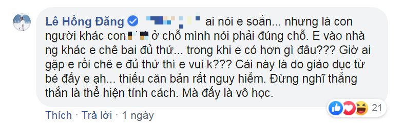 “Em vào nhà người khác chê bai đủ thứ trong khi em có hơn gì đâu. Giờ ai gặp em rồi chê em đủ thứ thì em vui không. Cái này là do giáo dục từ bé đấy em ạ. Thiếu căn bản rất nguy hiểm. Đừng nghĩ thẳng thắn là thể hiện tính cách mà đấy là vô học”.