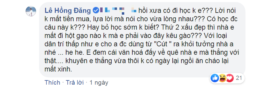 Thậm chí Hồng Đăng còn dùng từ “vô học”, “dân trí thấp” để đáp trả cư dân mạng