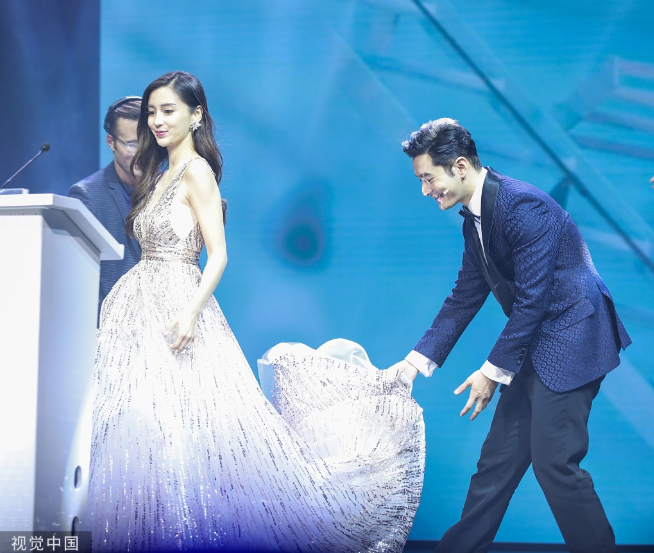 Đoạn video ghi lại cảnh Angela Baby bước đi như một nàng công chúa trong chiếc váy dạ hội dài thướt tha và đi sau là anh chồng Huỳnh Hiểu Minh đang khom người nâng váy giúp vợ của mình