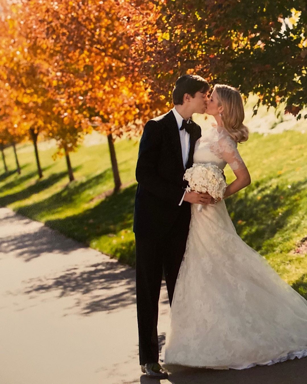 Trong ảnh được chia sẻ, Ivanka Trump đầy xinh đẹp khi mặc trên người chiếc váy cưới trắng, cô trao cho chồng của mình nụ hôn ngọt ngào dưới một khung cảnh đầy nắng và lá vàng