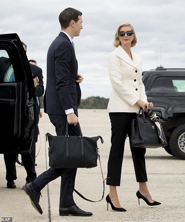 Con gái Tổng thống Trump bắt chước theo nàng Công nương quá cố khi cùng chồng đi công tác trong trang phục đậm chất công sở áo vest trắng cùng quần kaki đen nền nã đi kèm với túi Chanel