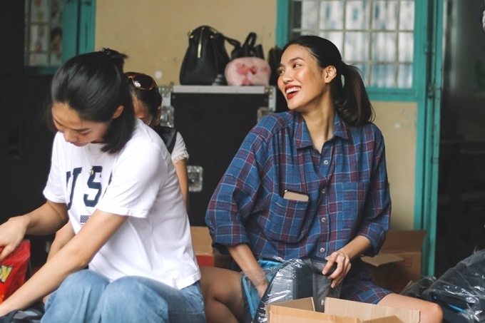 Trong khi ông xã phụ giúp mọi người khiêng vác đồ thì Lan Khuê ngồi soạn quà cho các em nhỏ