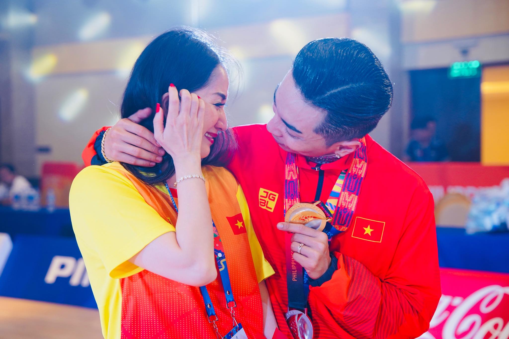 Chứng kiến ông xã giành HCV cùng bạn diễn, Khánh Thi vỡ oà sung sướng. Cô gục vào vai chồng khóc nức nở một lúc lâu. Bà mẹ hai con’ thổ lộ rằng, từ 2005 đến nay, đã 14 năm Dance sport Việt Nam không góp mặt trong Seagames, do đó với tư cách là HLV Dance sport Việt Nam cô rất vui bởi 2 cặp vận động viên đã mang về nhiều tấm huy chương vàng, bạc quý giá.