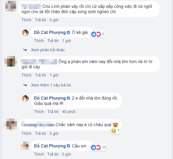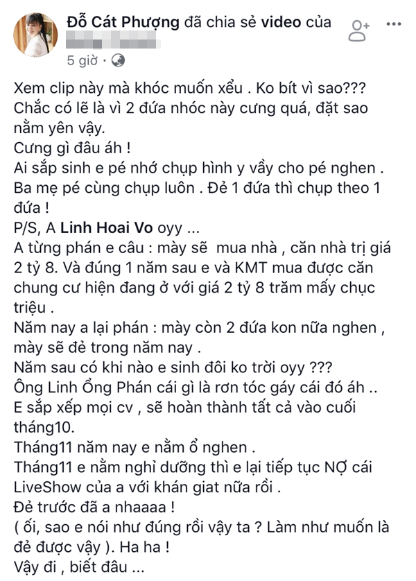 Mới đây, Cát Phượng bất ngờ chia sẻ một video về quá trình chụp ảnh của các bé sơ sinh với dòng trạng thái bày tỏ sự xúc động cũng như yêu thích. Bên cạnh đó, nữ nghệ sĩ cũng kể về việc được “anh Bốn” Hoài Linh đưa ra lời tiên đoán chính xác chuyện mua nhà của cô và tiếp tục phán: “Mày còn 2 đứa con nữa nghen, mày sẽ đẻ trong năm nay. Năm sau có khi nào e sinh đôi không trời ơi ??? Ông Linh Ổng Phán cái gì là rợn tóc gáy cái đó áh..“.