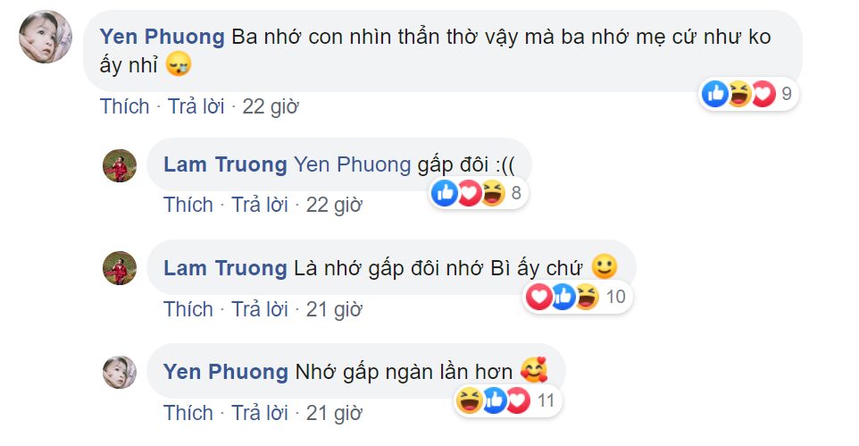 Sau khi được ông xã tag vào hình thì Yến Phương đã tỏ ra giận dỗi ghen tỵ, cô bình luận: “Ba nhớ con nhìn thẫn thờ vậy mà ba nhớ mẹ cứ như không ấy nhỉ”.