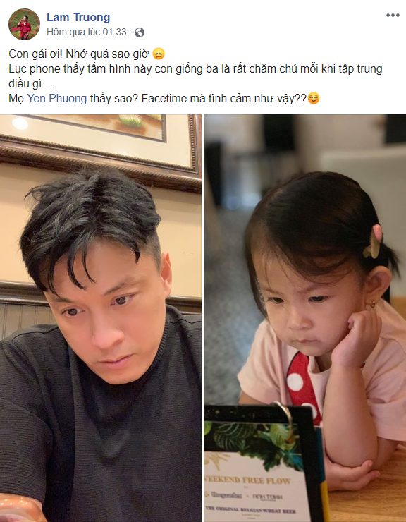 Cụ thể, trên trang cá nhân của Lam Trường anh đã đăng tải hình ảnh so sánh con gái Phoebe “giống ba” mỗi khi chăm chú tập trung vào điều gì và than nhớ cô bé.