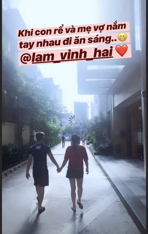 Mới đây trên trang cá nhân của mình, Linh Chi đã tiết lộ mối quan hệ giữa mẹ vợ cũng như “con rể tương lai”. Nữ người mẫu chia sẻ “Con rể nắm tay mẹ vợ đi ăn sáng rất tình cảm” đi kèm đó là hình ảnh chụp Lâm Vinh Hải cùng mẹ ruột của mình vào một buổi sáng sớm.