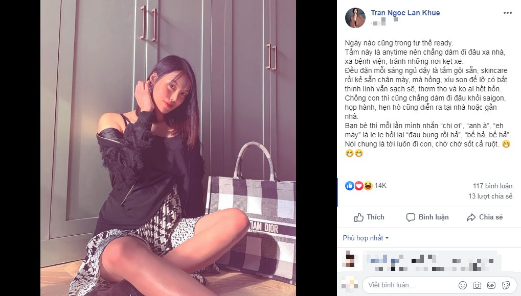 Lan Khuê kể: “Ngày nào cũng trong tư thế sẵn sàng. Tầm này là sinh bất cứ lúc nào nên chẳng dám đi đâu xa nhà, xa bệnh viện, tránh những nơi kẹt xe. Đều đặn mỗi sáng ngủ dậy là tắm gội sẵn, skincare rồi kẻ sẵn chân mày, má hồng, xíu son để lỡ có bất thình lình vẫn sạch sẽ, thơm tho và không ai hết hồn. Chồng con thì cũng chẳng dám đi đâu khỏi Sài Gòn, họp hành, hẹn hò cũng diễn ra tại nhà hoặc gần nhà. Bạn bè thì mỗi lần mình nhắn “chị ơi”, “anh à”, “ê mày” là lẹ lẹ hỏi lại “đau bụng rồi hả”, “bể hả, bể hả”. Nói chung là tới luôn đi con, chờ chờ sốt cả ruột”.