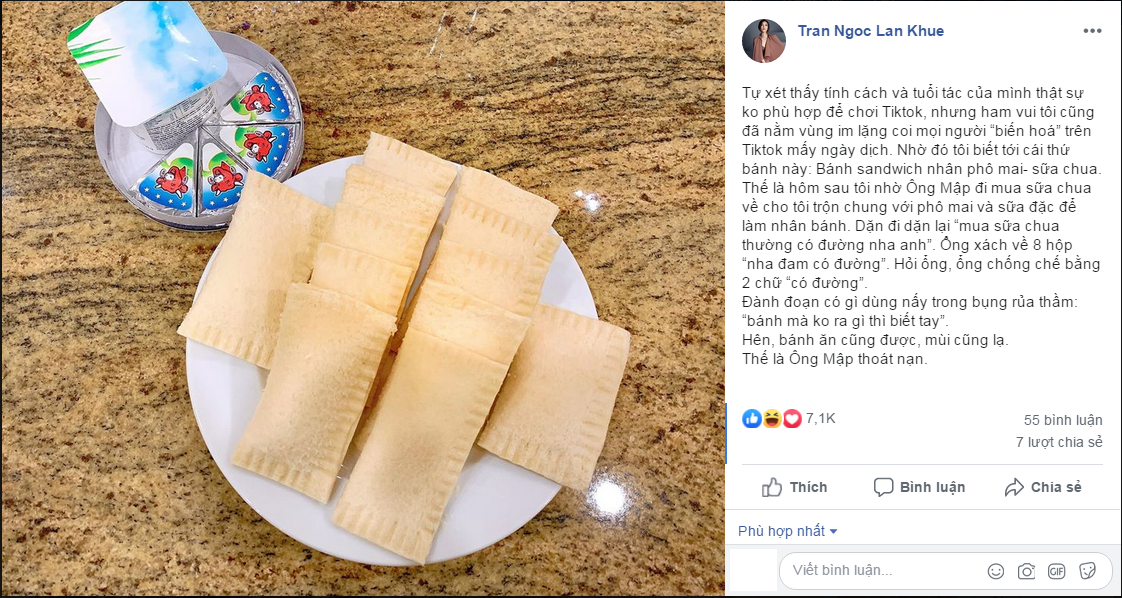 “Tự xét thấy tính cách và tuổi tác của mình thật sự ko phù hợp để chơi Tiktok, nhưng ham vui tôi cũng đã nằm vùng im lặng coi mọi người “biến hoá” trên Tiktok mấy ngày dịch. Nhờ đó tôi biết tới cái thứ bánh này: Bánh sandwich nhân phô mai- sữa chua.