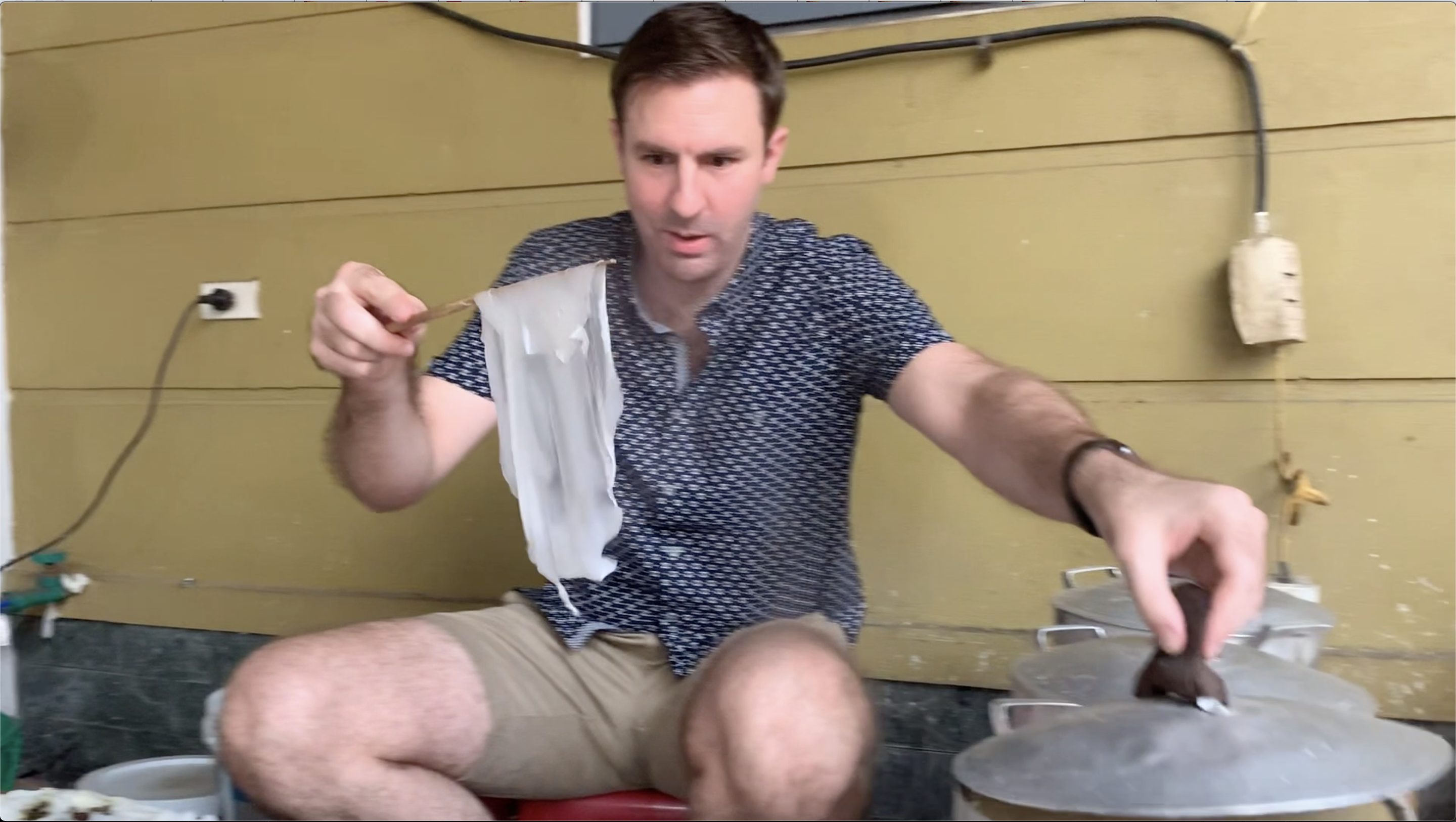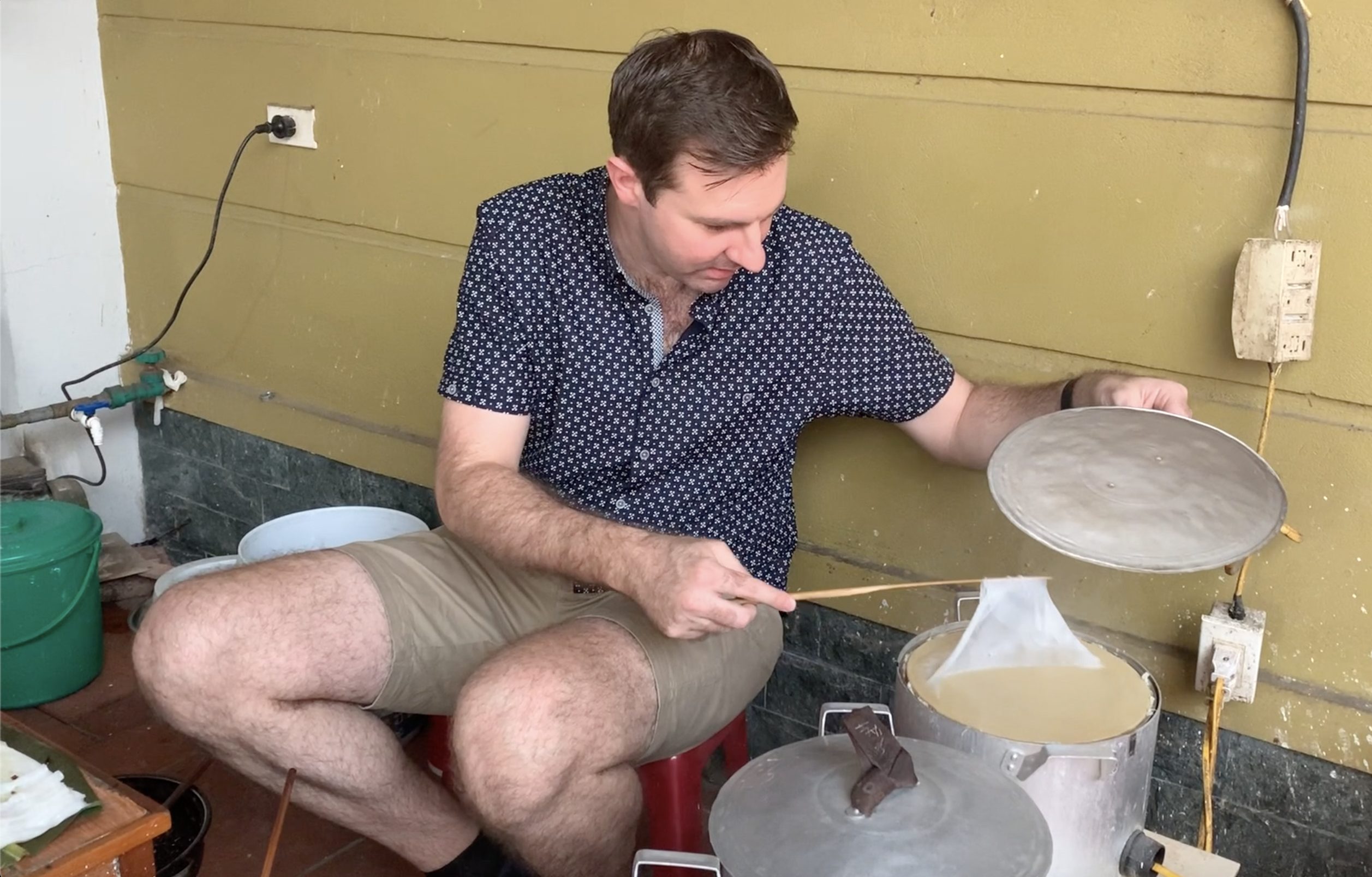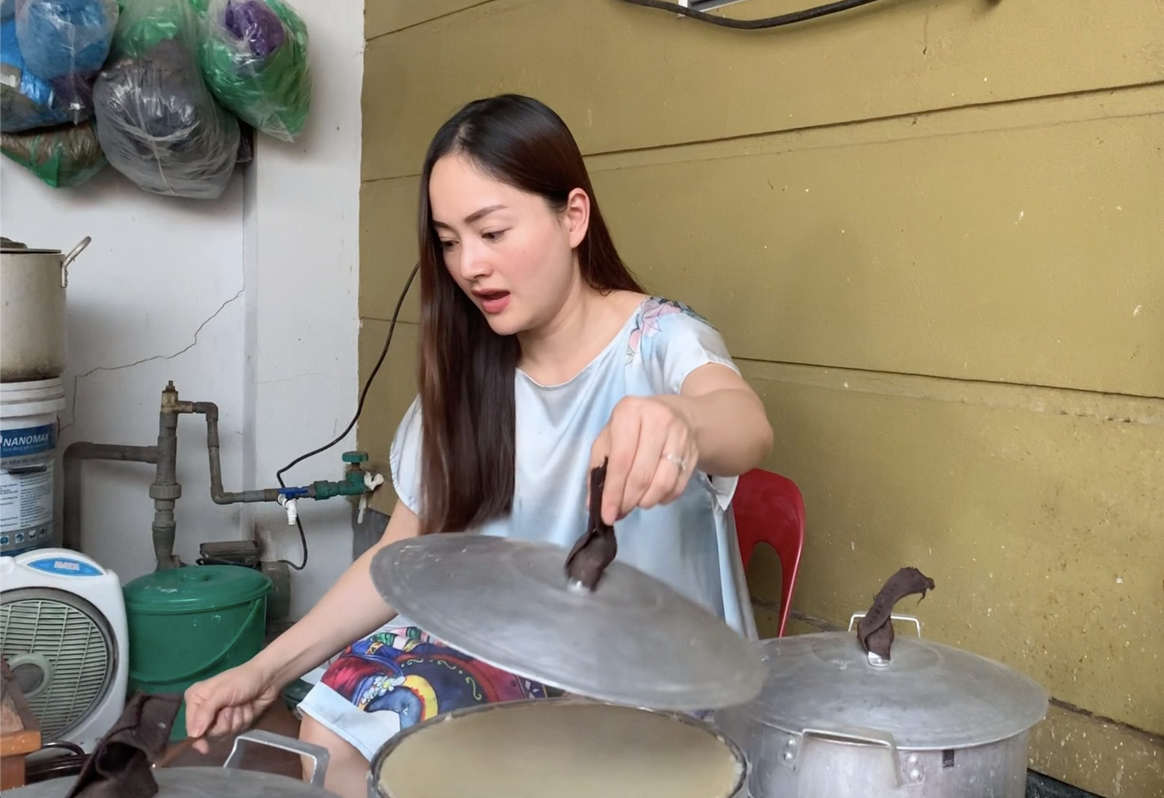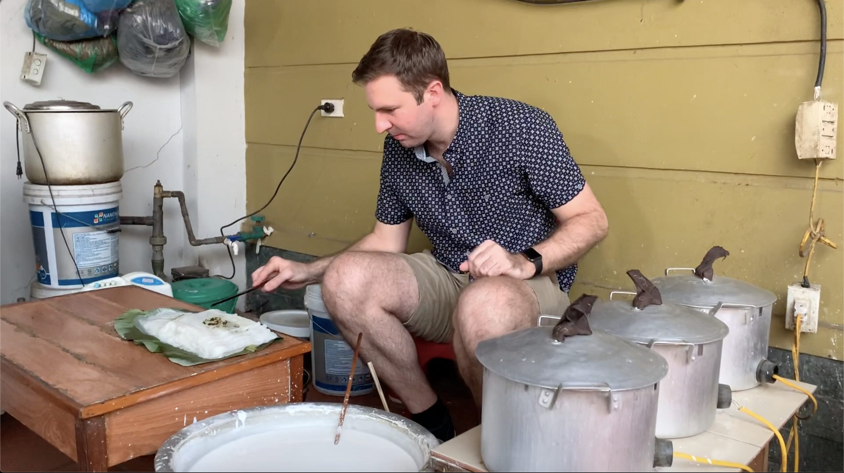 Chồng Tây và Lan Phương trong thử thách làm bánh cuốn “khó nhằn”.