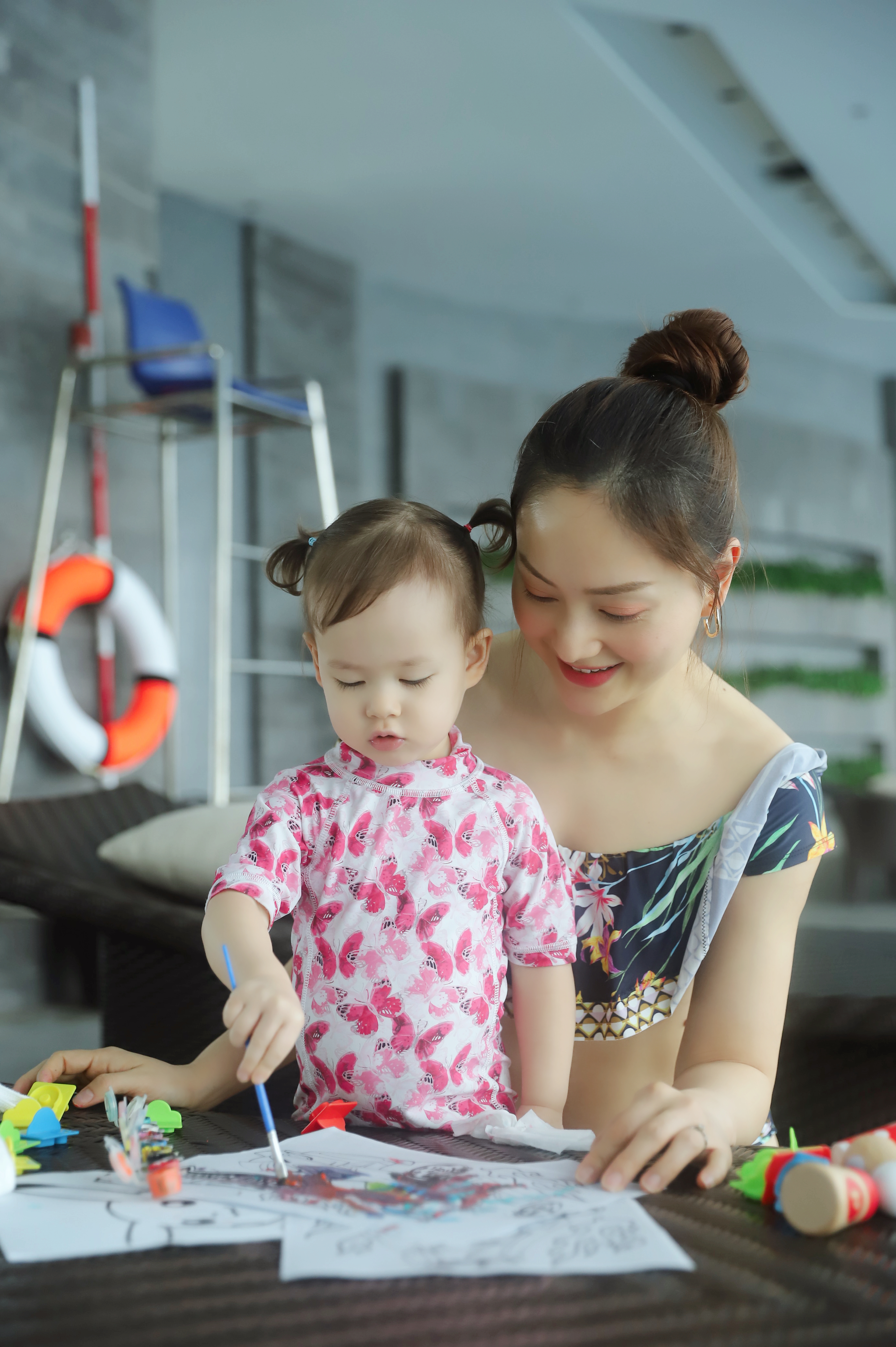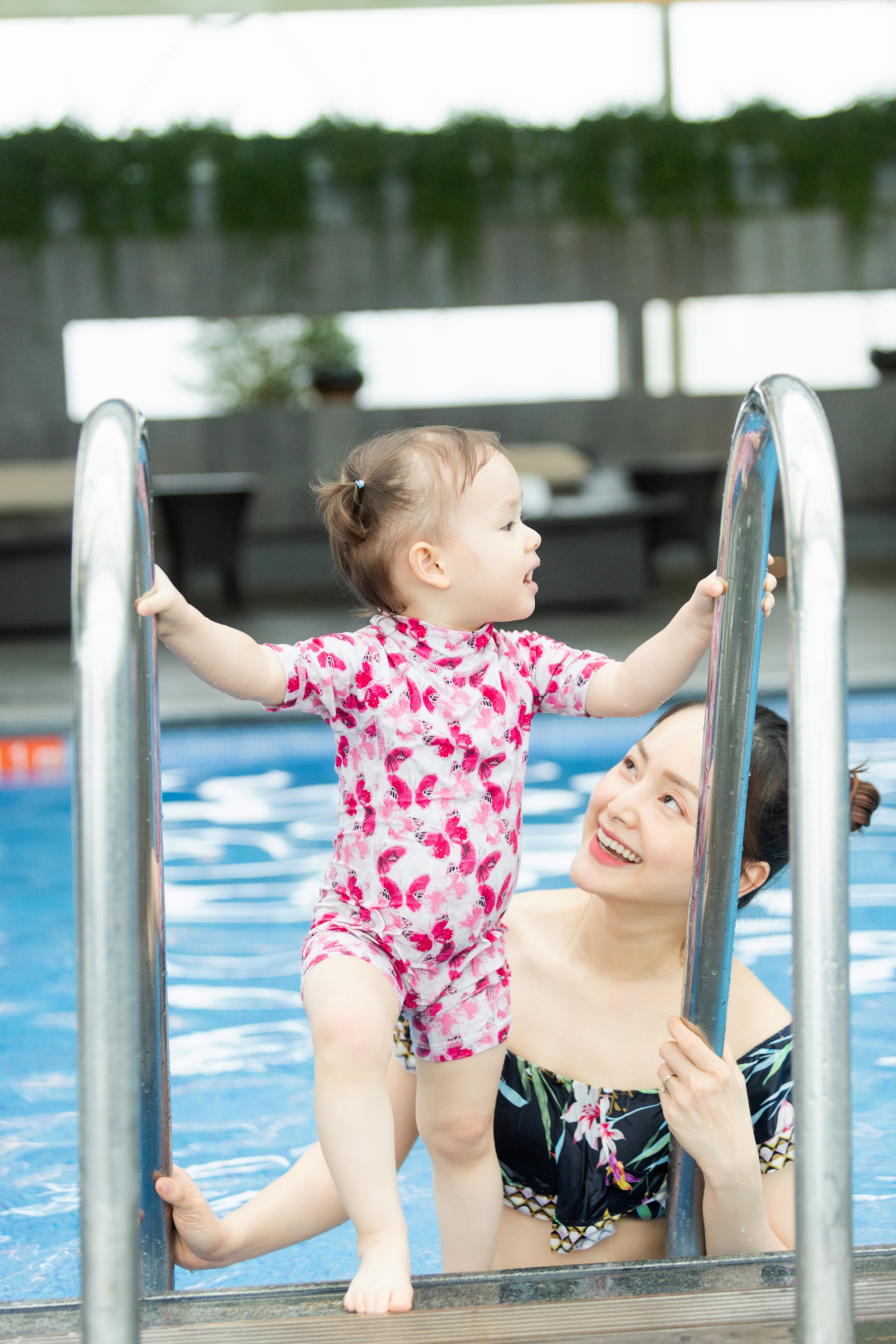 Lina tuy còn bé nhưng tỏ ra khá dạn dĩ khi xuống hồ, cô bé thích thú đùa nghịch cùng mẹ trong làn nước mát. Tranh thủ những lúc vui chơi cùng con, Lan Phương sẽ dạy cho bé thêm về những kiến thức nhỏ xung quanh. Nữ diễn viên mong muốn mình không chỉ là mẹ mà sẽ như một người bạn đồng hành trong quá trình trưởng thành của con gái.