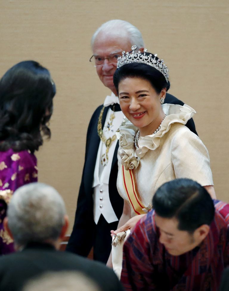 1. Hoàng hậu Masako của Nhật Bản dùng vương miện Meiji Tiara giống mẹ chồng trong lễ lên ngôi của Thái tử Akihito vào năm 1990. Vương miện của bà tỏa sáng trong bữa tiệc với hàng ngàn viên kim cương gắn vào khung bạch kim.
