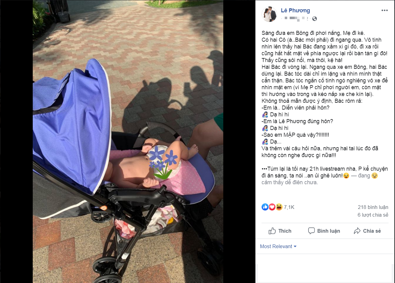 Lê Phương kể, có nhiều khán giả nhận ra cô là diễn viên nên tiến đến bắt chuyện. Một trong số họ đưa ra nhận xét bà mẹ hai con mập và xấu hơn trên ảnh