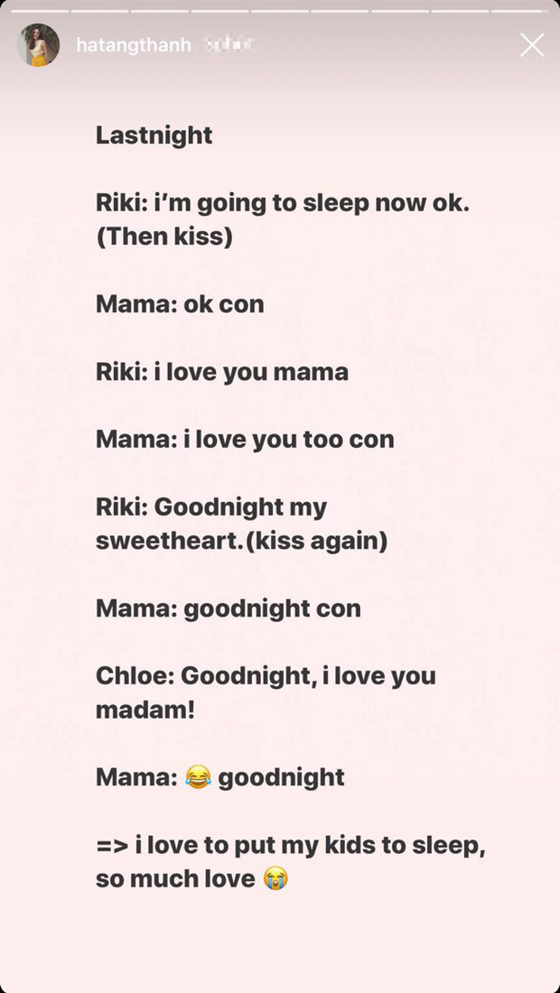 Mới đây, nàng ngọc nữ đã khiến người hâm mộ và cư dân mạng được một phen ‘lịm tim’ khi chia sẻ lại đoạn hội thoại bằng tiếng Anh trước khi đi ngủ giữa cô cùng hai nhóc tỳ. Theo đó, trong khi con trai Richard Nguyễn gọi mẹ là “tình yêu của con” thì cô bé Chloe Nguyễn lại gọi mẹ bằng cái tên hài hước là “quý bà”.