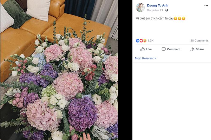 Mới đây trên trang cá nhân, Á hậu Tú Anh vừa chia sẻ hình ảnh một bó hoa cẩm tú cầu lớn kèm theo đó là dòng chú thích: “Vì biết em thích cẩm tú cầu.”