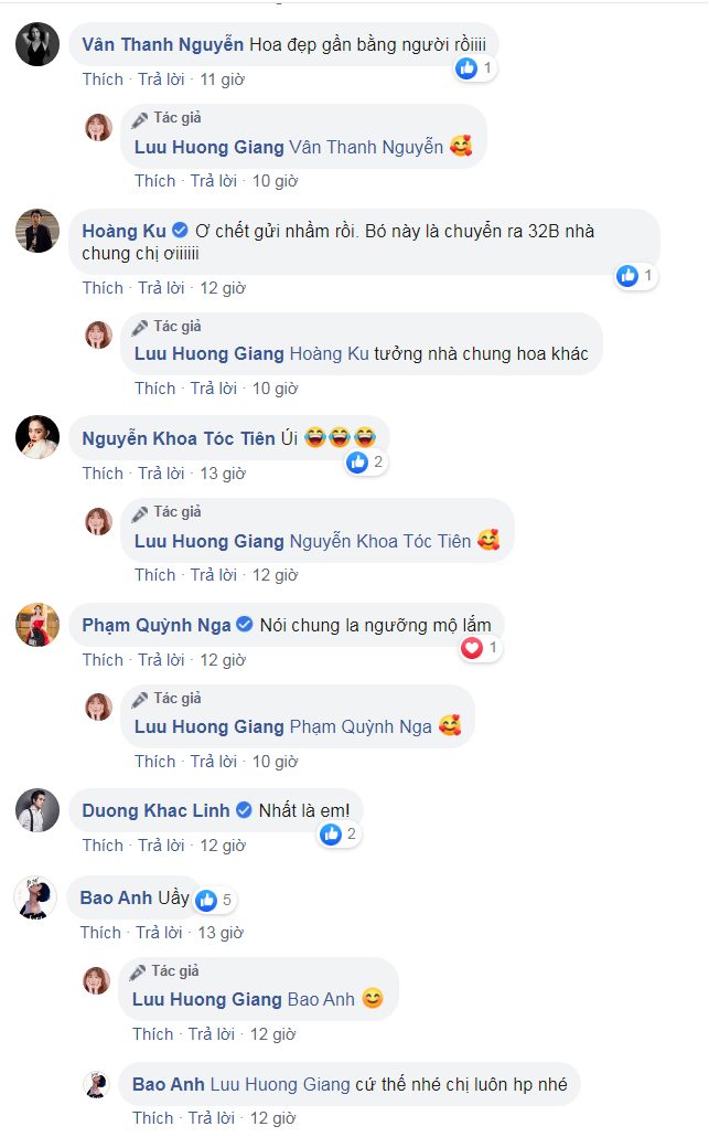 Sau khi đăng tải bức ảnh ôm bó hoa của Lưu Hương Giang đã nhanh chóng được đông đảo nghệ sĩ Việt như nhạc sĩ Dương Khắc Linh, Tóc Tiên, Bảo Anh, Vân Hugo,… để lại bình luận xuýt xoa ghen tỵ. Đặc biệt nữ ca sĩ Bảo Anh còn nhắn nhủ đàn chị của mình rằng: “Cứ thế nhé chị, luôn hạnh phúc nhé”.
