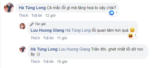 Khi có người bạn hỏi 'chồng mắc lỗi gì mà tặng hoa to vậy', Lưu Hương Giang khiến nhiều người thích thú khi trả lời 'lỗi quan tâm hơi quá'