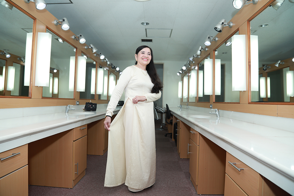 Bác Trần Thị Minh Thêu vui vẻ trong tà áo dài duyên dáng
