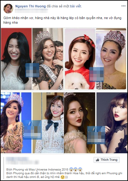 Một lần nữa, bà mẹ “mầy lội nhất vịnh Bắc Bộ” lại chứng minh cho mọi người thấy “hổ phụ sinh hổ tử” bằng một bài post chia sẻ những hình ảnh của Bích Phương và nàng hậu Indonesia kia kèm dòng chú thích: “Gớm khéo nhận vơ, hàng nhà này là hàng lép có bản quyền nhé, không bao giờ đụng hàng nhé!“.