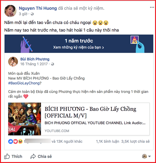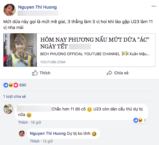 Thế nhưng, ý kiến của mẹ Bích Phương hoàn toàn trái chiều với số đông mọi người khi nói nữ ca sĩ có khả năng nữ công gia chánh giỏi. Mẹ của nữ ca sĩ đã chia sẻ những đoạn clip mà cô nấu ăn về trang cá nhân và để lại những lời bình luận hết sức “bá đạo”. Cụ thể, cô Hương - mẹ của Bích Phương viết: “Mứt này gọi là mứt mê trai, 3 thằng làm 3 vị thôi, khi nào gặp U23 làm 11 vị nha mày!”.