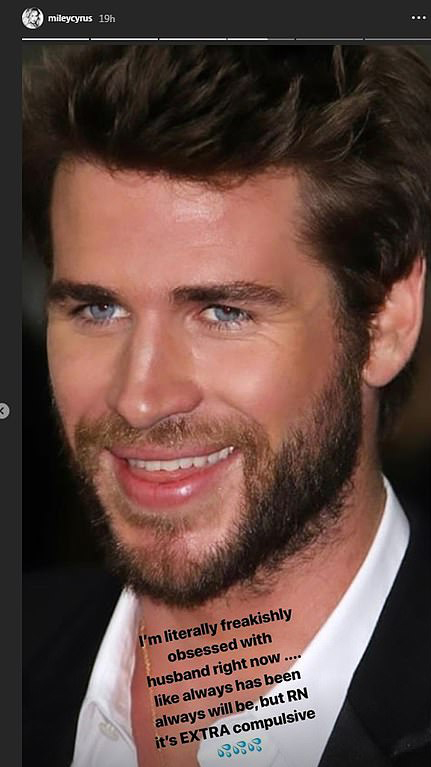 Tối 25/4 vừa qua, Miley Cyrus gây chú ý khi chia sẻ trên Instagram Story bức ảnh chân dung Liam Hemsworth từ lễ ra mắt phim “Avengers: Endgame”. Tài tử người Úc diện vest lịch lãm, nở nụ cười quyến rũ trước ống kính. Miley dường như quá mê bức ảnh này và ông xã điển trai nên không ngần ngại thổ lộ: “Tôi thực sự bị ám ảnh ghê gớm với chồng tôi. Kiểu như, lúc nào cũng vậy, luôn luôn sẽ như vậy, nhưng ngay lúc này chỉ muốn 'cưỡng bức' thôi”.