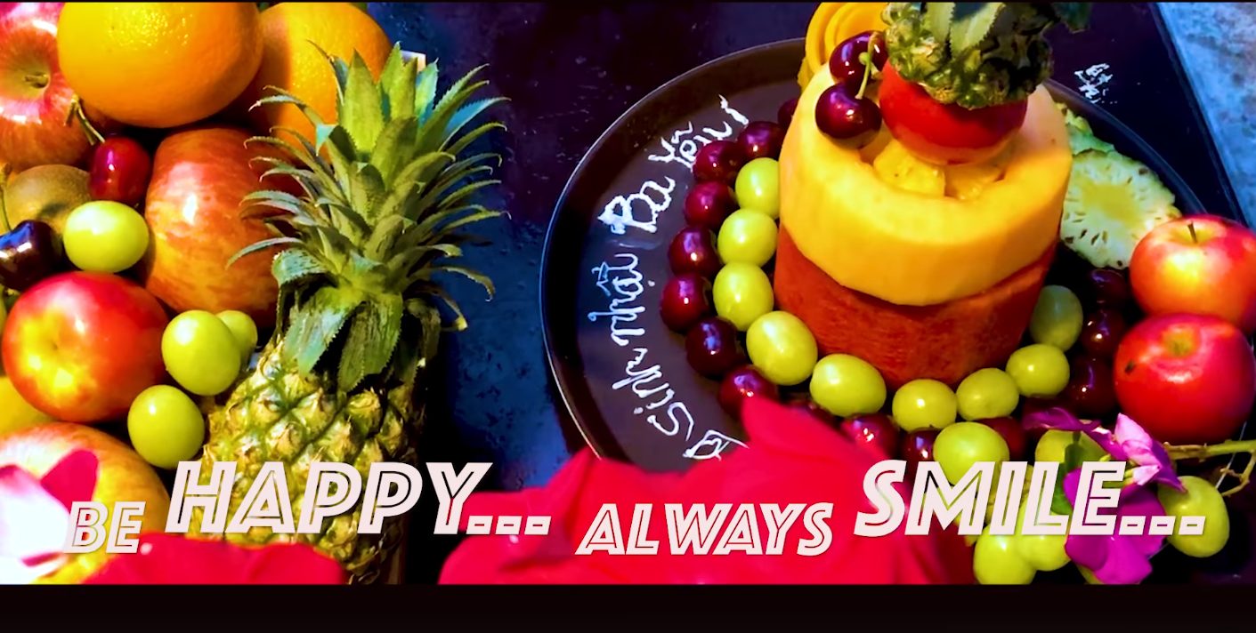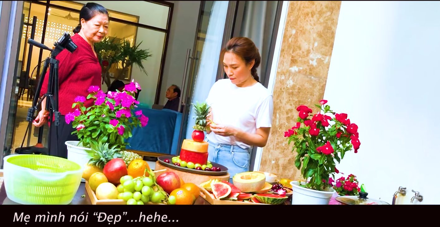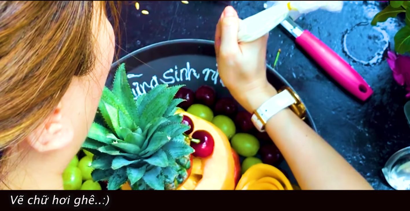 Sau màn làm pudding thì Mỹ Tâm tiếp tục làm bánh hoa quả, nữ ca sĩ chuẩn bị các loại hoa quả, cắt và tạo hình thành chiếc bánh sinh nhật đẹp mắt