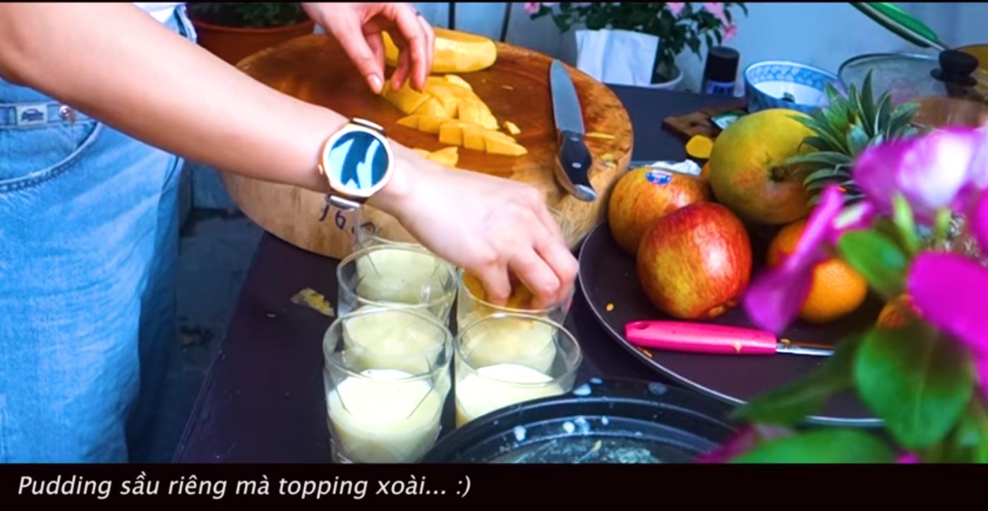 Món đầu tiên mà Mỹ Tâm xắn tay làm chính là pudding sầu riêng với các nguyên liệu quen thuộc như sầu riêng, sữa đặc, gelatin… và topping xoài