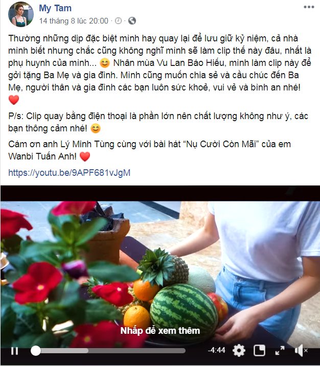 Mỹ Tâm đăng tải đoạn clip như một món quà dành tặng bố mẹ nhân ngày lễ Vu Lan