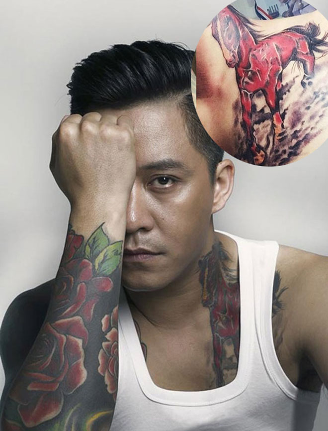 Tuấn Hưng xăm hình ngựa trên cổ vì bà xã và con trai đều sinh năm Ngọ.