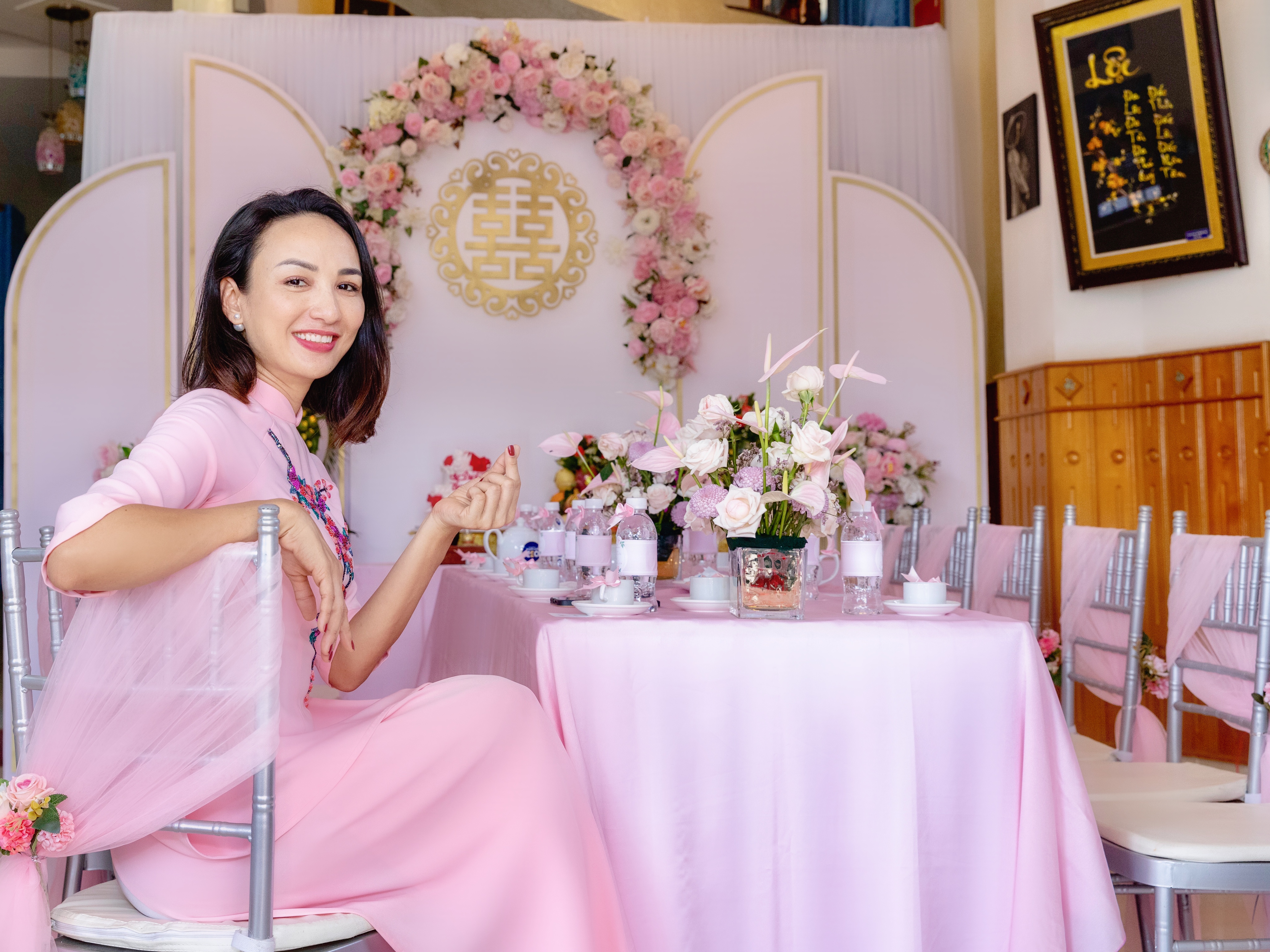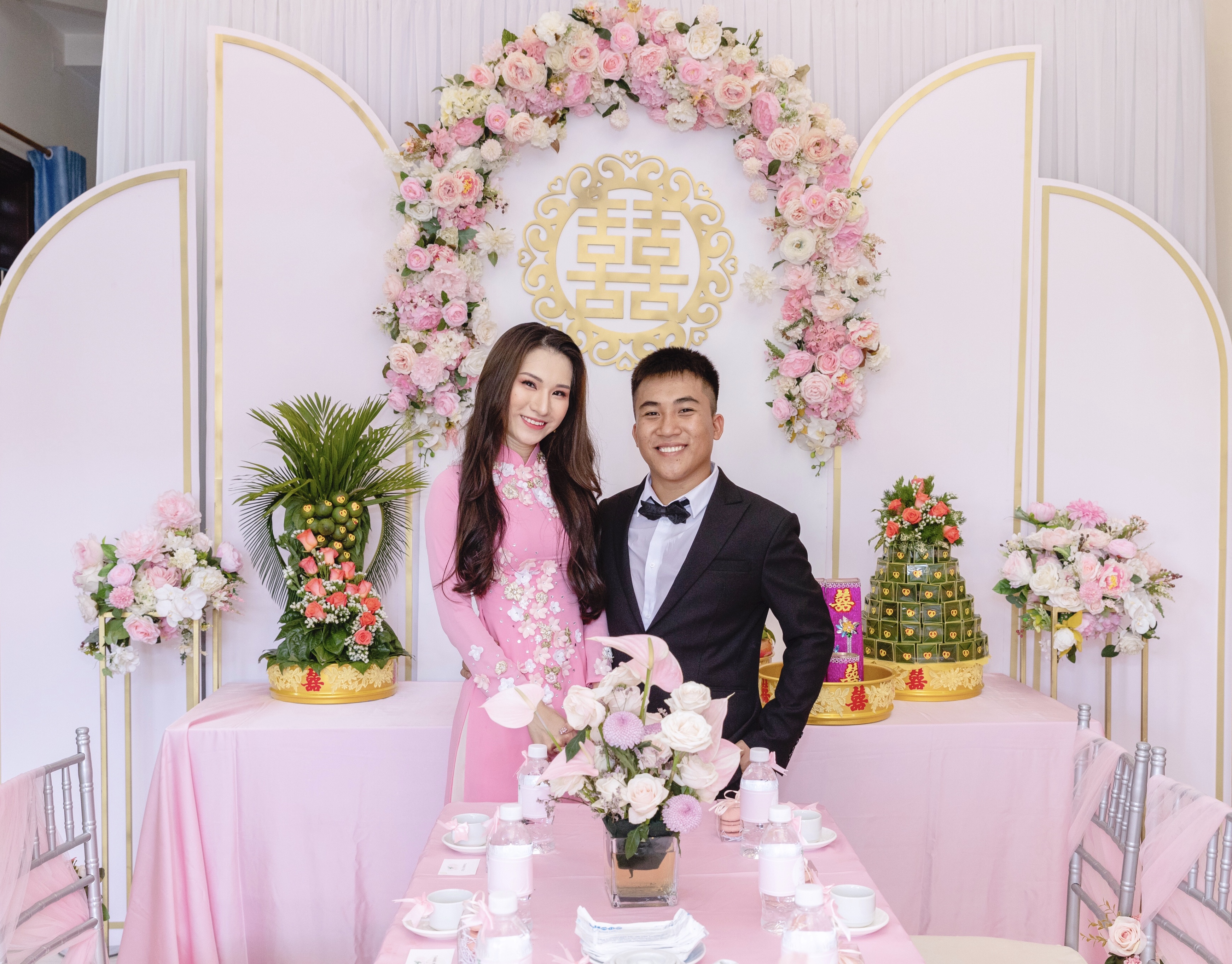 Vân Kiều cùng chồng sắp cưới của mình trong buổi lễ đính hôn ngập tràn sắc hồng vừa qua