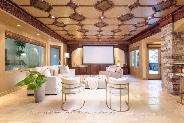 Nó có 7 phòng ngủ, 9 phòng tắm, hầm rượu, bếp ngoài trời, phòng chiếu phim cùng nhiều tiện nghi khác.