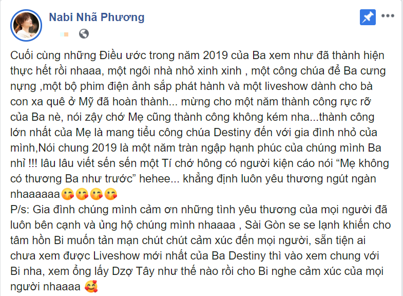 “Cuối cùng những Điều ước trong năm 2019 của Ba xem như đã thành hiện thực hết rồi nhaaa, một ngôi nhà nhỏ xinh xinh , một công chúa để Ba cưng nựng ,một bộ phim điện ảnh sắp phát hành và một liveshow dành cho bà con xa quê ở Mỹ đã hoàn thành… mừng cho một năm thành công rực rỡ của Ba nè, nói vậy chớ Mẹ cũng thành công không kém nha…thành công lớn nhất của Mẹ là mang tiểu công chúa Destiny đến với gia đình nhỏ của mình.