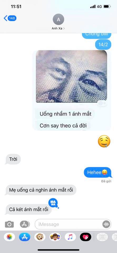 Theo hình ảnh Nhã Phương chia sẻ, có thể thấy ngay sau khi cô vừa gửi bức hình tờ tiền có mệnh giá 500.000 đồng nhưng được zoom cận vào khuôn mặt và đôi mắt kèm lời nhắc: “Chồng ơi, 14/2, uống nhầm một ánh mắt, cơn say theo cả đời”, thì Trường Giang đã lập tức than trời và đáp lại: “Mẹ uống cả nghìn ánh mắt rồi. Cả két ánh mắt rồi”.