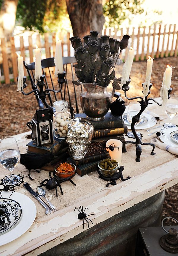 Điểm nhấn của bàn tiệc này chính là lọ hoa hồng đen, một hộp sọ, hộp chứa “mắt” và những cây nến thường gặp trong các phim cổ xưa cùng những chú nhện bò khắp bàn ăn.