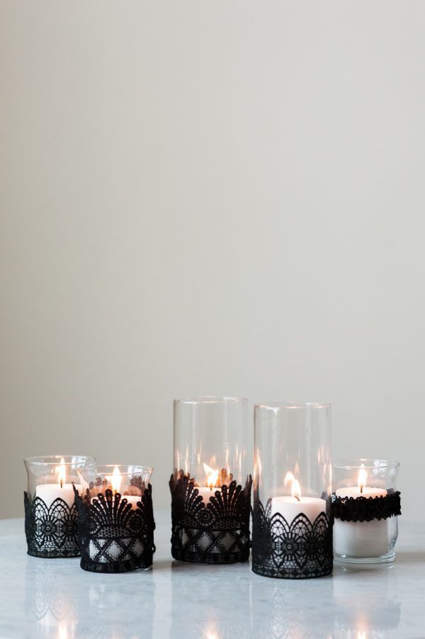 Những chiếc cốc nến được bọc bởi vải ren đen này đem tới không gian đầy ám ảnh.