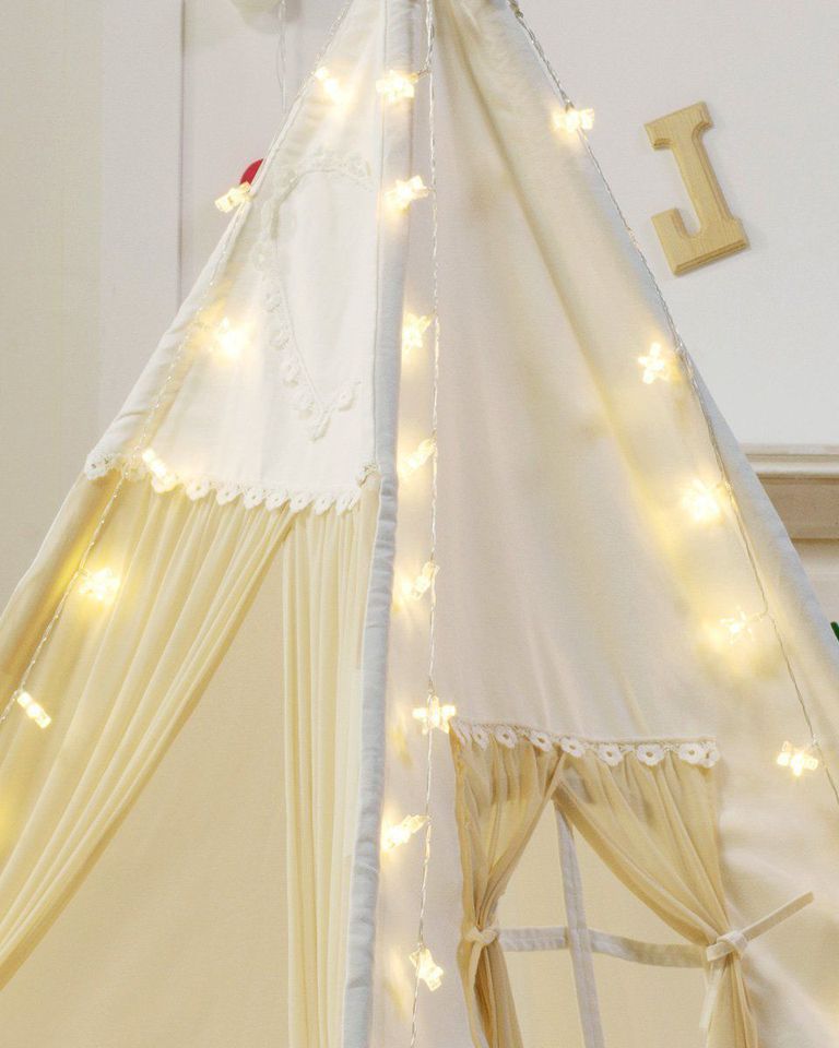 Một chiếc lều rực rỡ những ánh đèn trang trí cho bé không gian cổ tích hằng mong ước.