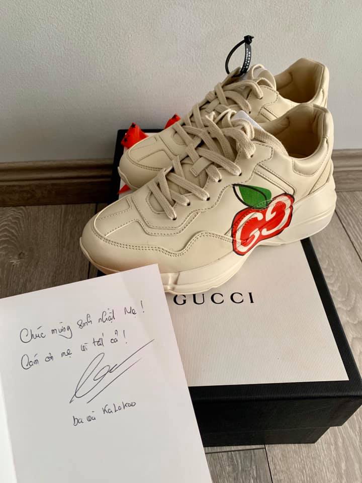 “3h sáng. Giữa khung cảnh giường chiếu lộn xộn và bầy con đang ngủ say kế bên. Mặc đồ bộ mang giày Gucci ngủ luôn. Thật ra cái giá trị nặng nhất là tấm thiệp. Và, em không cần đồ đắt tiền, nhưng… có thì cũng tốt anh à, mừng sinh nhật của chúng ta”, nữ diễn viên hạnh phúc viết trên trang cá nhân.