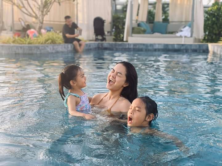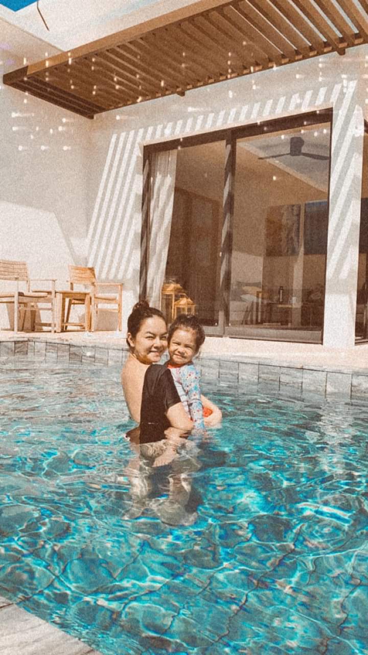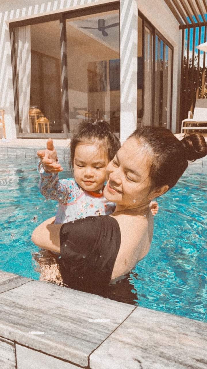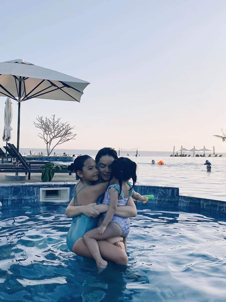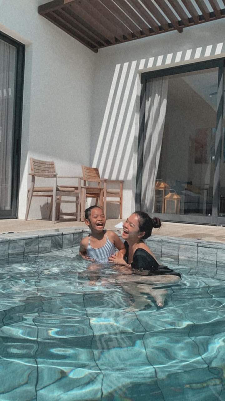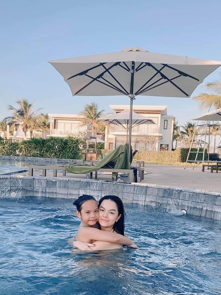 Cụ thể khi cả ba mẹ con đang bơi ở bể bơi chung tại khách sạn, thì bé Tuệ Lâm đã đề nghị mẹ về bể nhỏ của phòng mình bơi cho an toàn