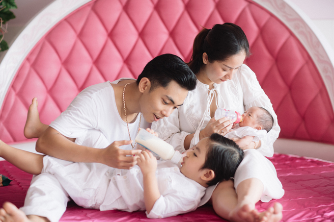 Mặc dù còn vụng về như cho con ti bình ngược nhưng Phan Hiển còn khiến nhiều người trầm trồ khen ngợi về việc san sẻ việc chăm sóc con với vợ. “Anh cả” KuBi cũng vô cùng ra dáng khi liên tục nựng em gái.